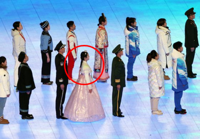 지난 2월 4일 중국 베이징 국립 경기장에서 열린 '2022 베이징 동계올림픽' 개막식에서 소수민족 중 한 명이 한복을 입고 있다.